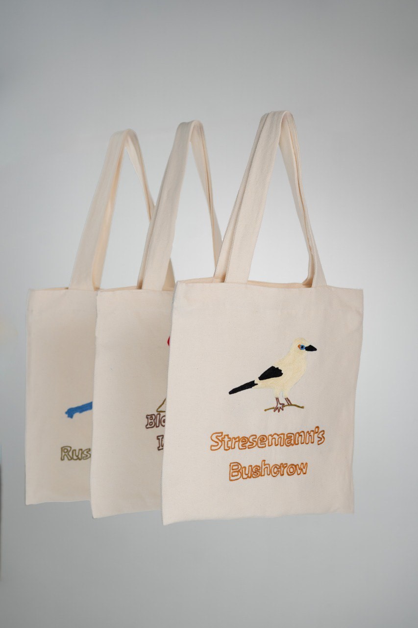 This embroidered tote bag design showcases the Stresemann’s Bushcrow, one of Ethiopia’s endemic birds, embroidered in vibrant threads.