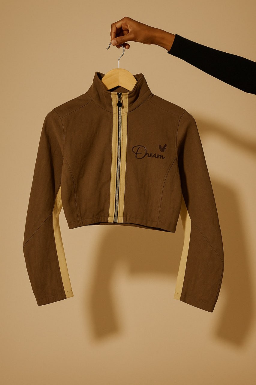 The jacket is made from fully handwoven cotton fabric. It has a logo embroidered on the left chest.